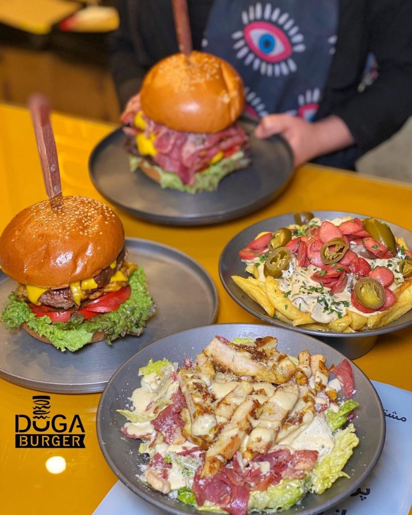 رستوران دوگا برگر با منوی غذایی متنوع با دو شعبه در آمریکا و مجتمع عرش آجودانیه انواع برگرهای آمریکایی،چیکن برگرهای آمریکایی، سیبزمینیها، سالاد ویژه و پیاز سوخاری را به همراه آپشن های پمپ پنیر و سس قارچ جهت لذت بردن شما مشتریای عزیز تهیه و تدارک دیده است .